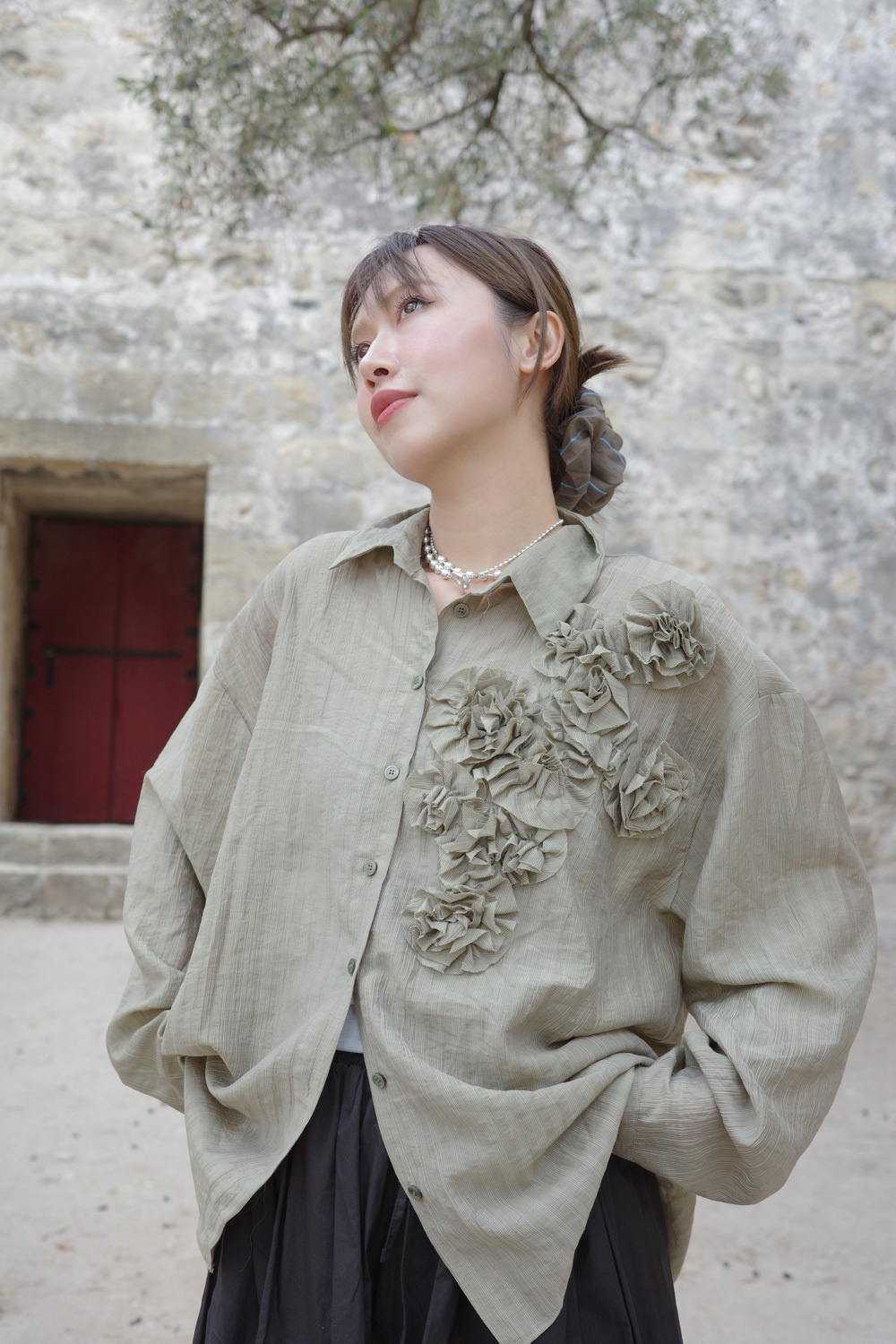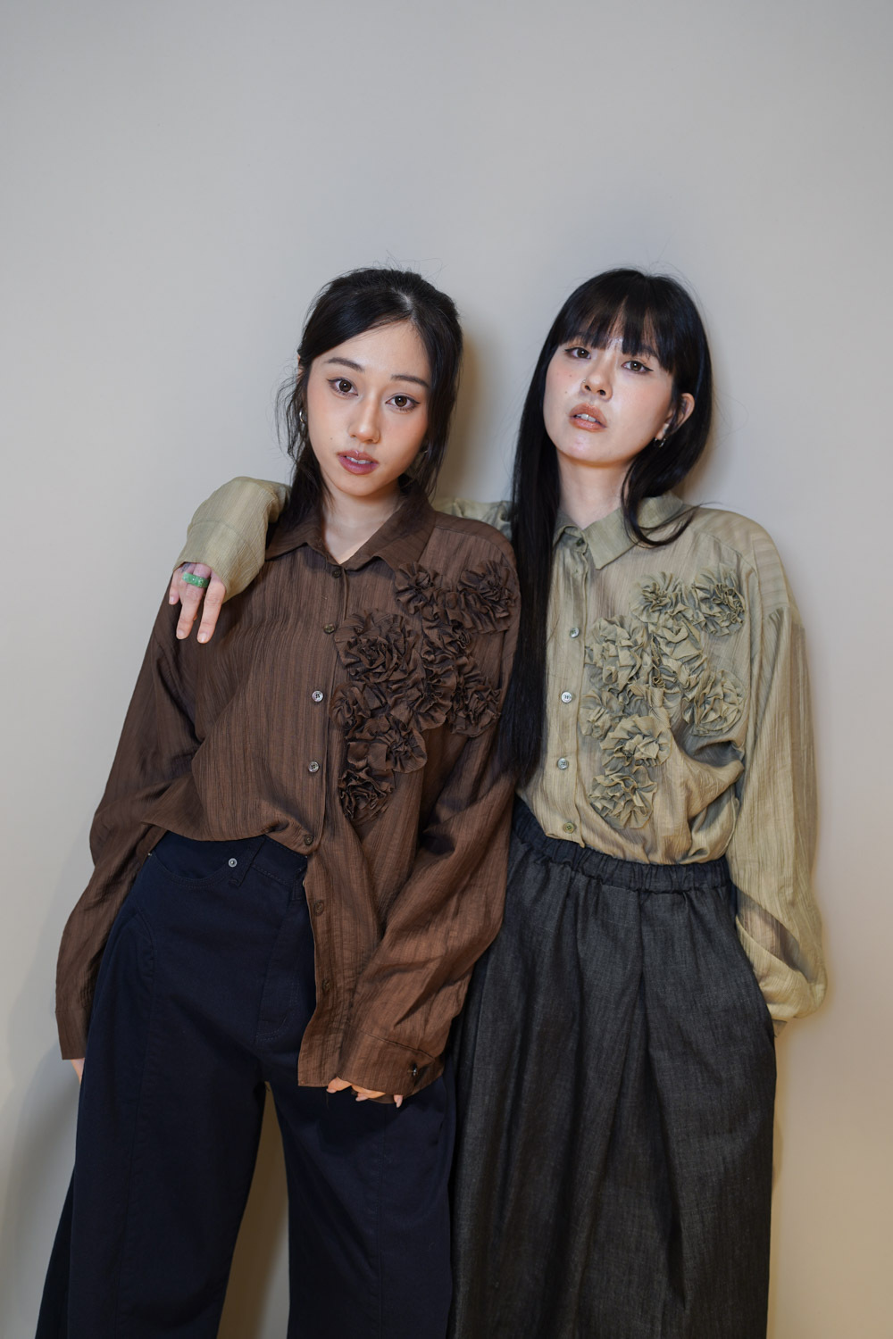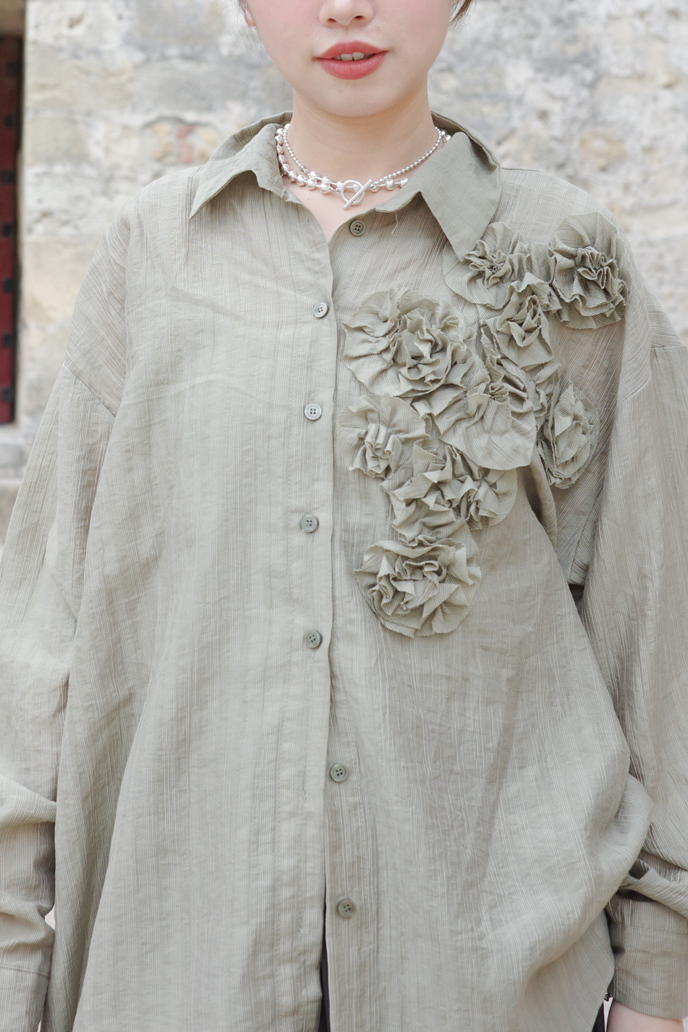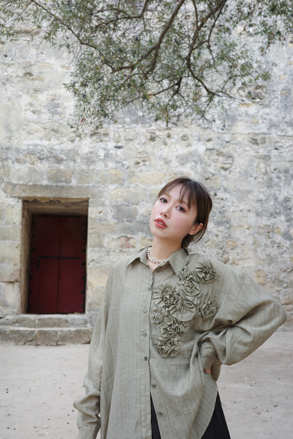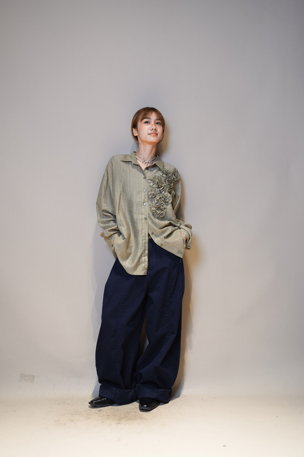 左邊胸前立體同款布料玫瑰花裝飾 玩味感十足/時尚不無聊/
