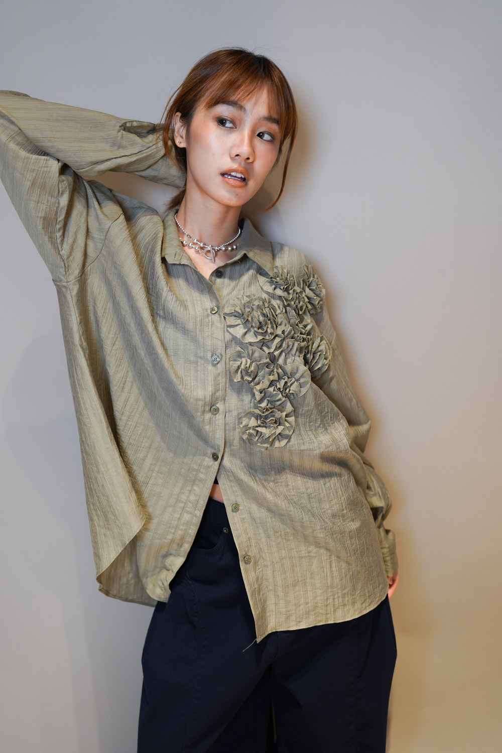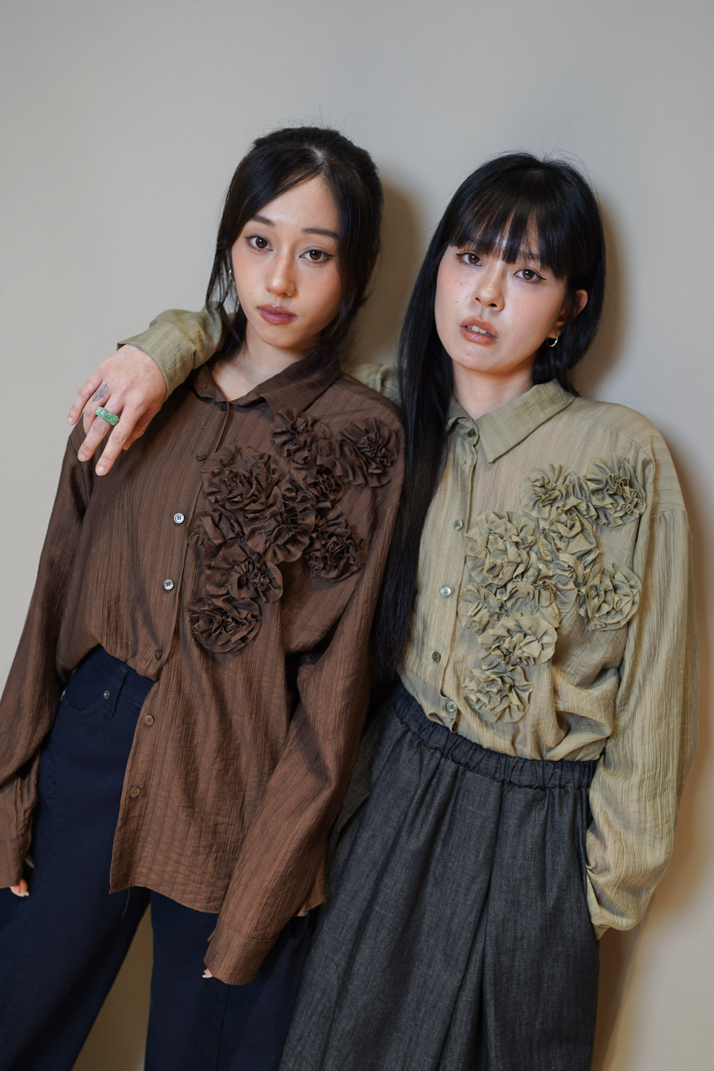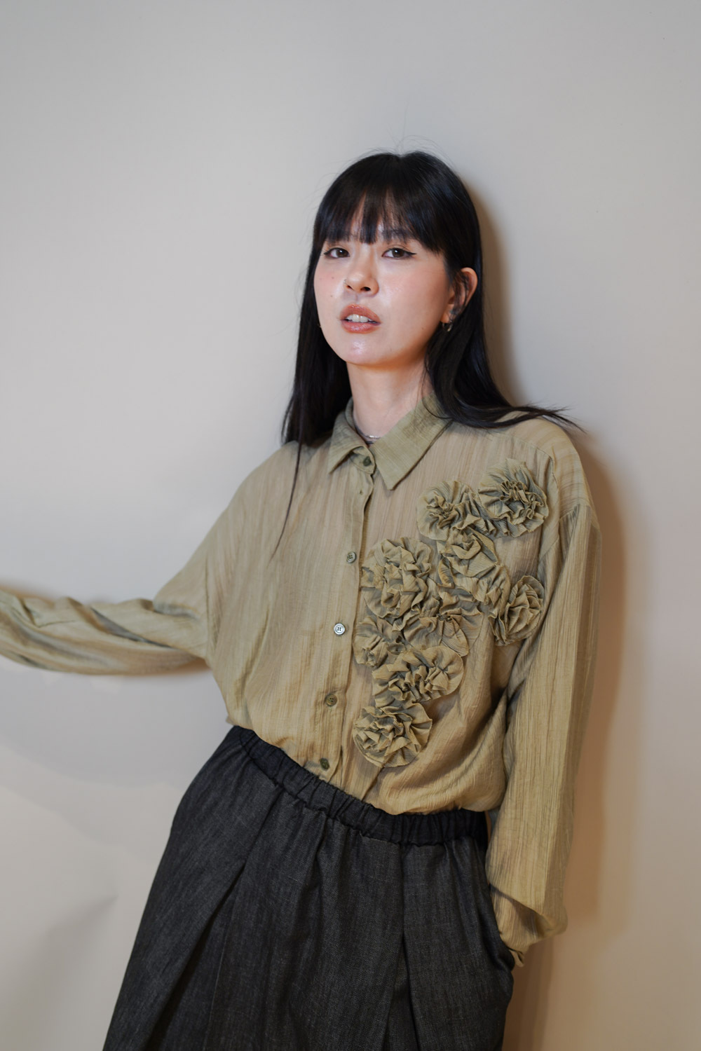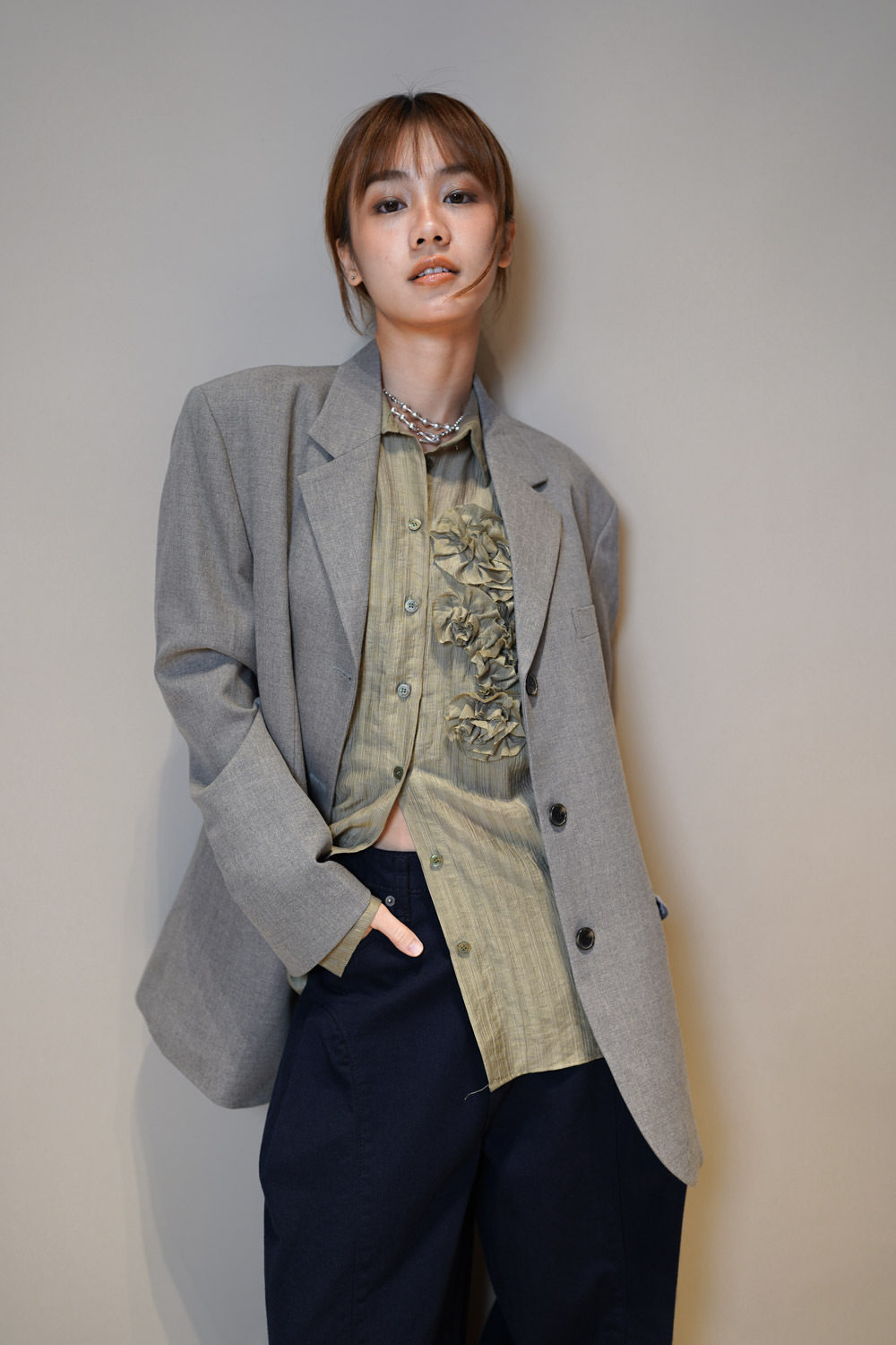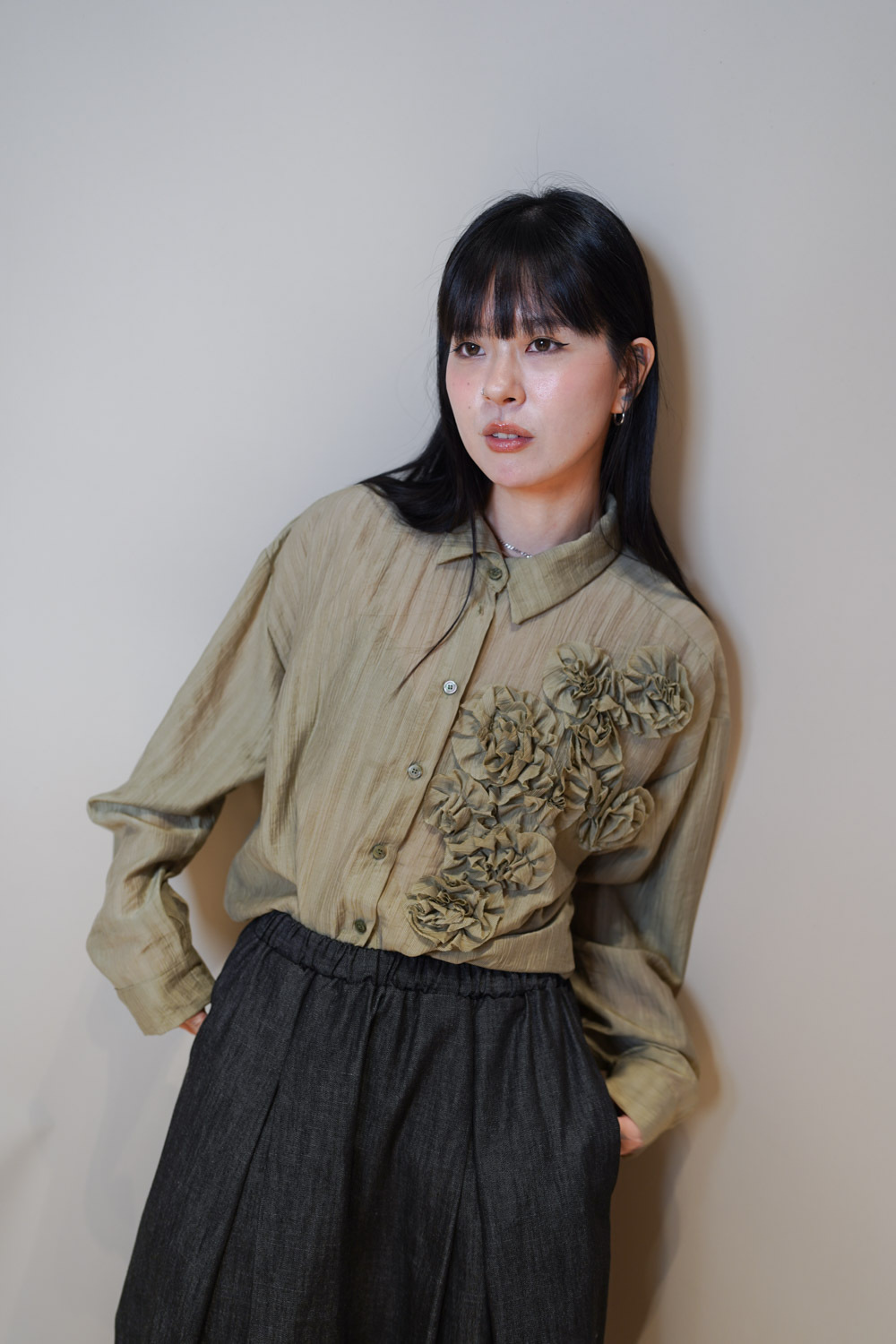 左邊胸前立體同款布料玫瑰花裝飾 玩味感十足/時尚不無聊/