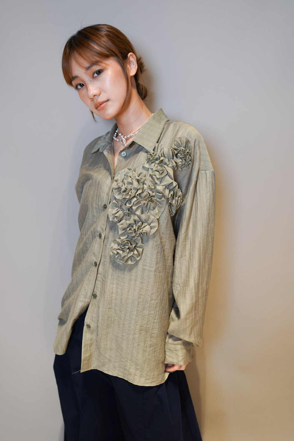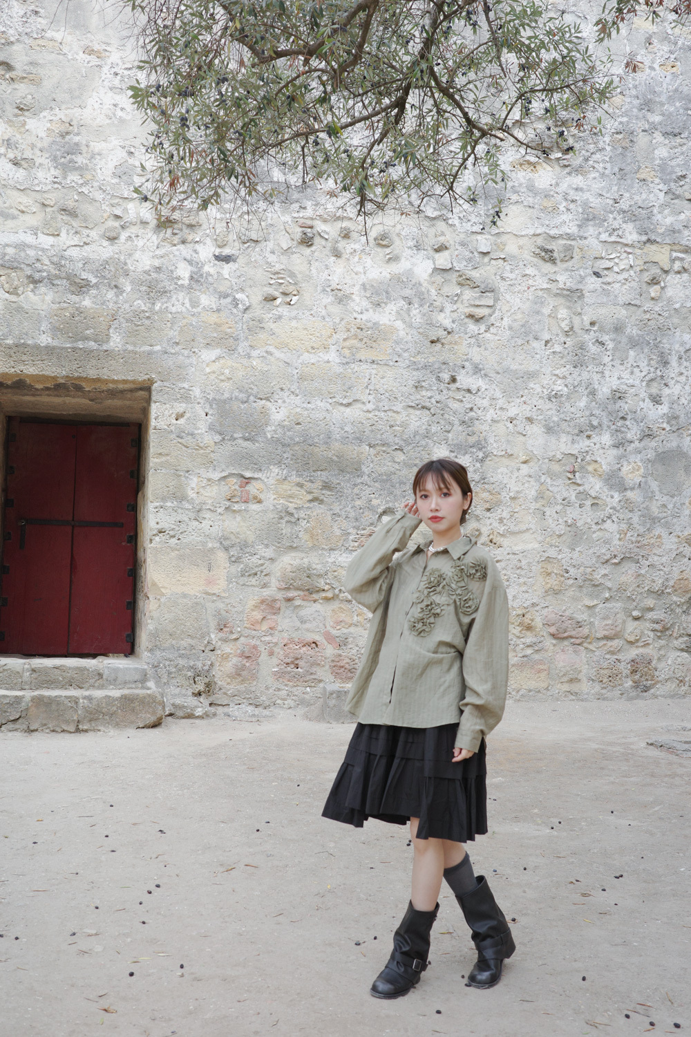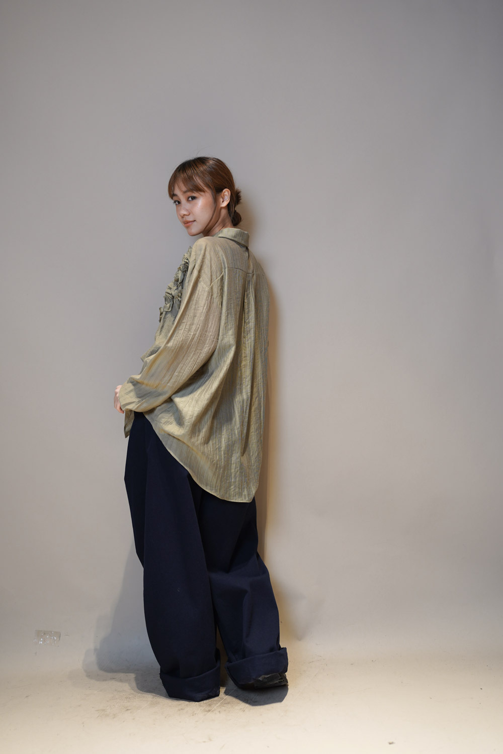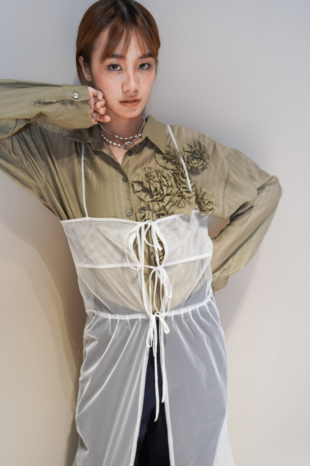 左邊胸前立體同款布料玫瑰花裝飾 玩味感十足/時尚不無聊/