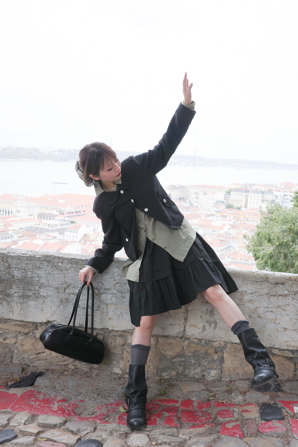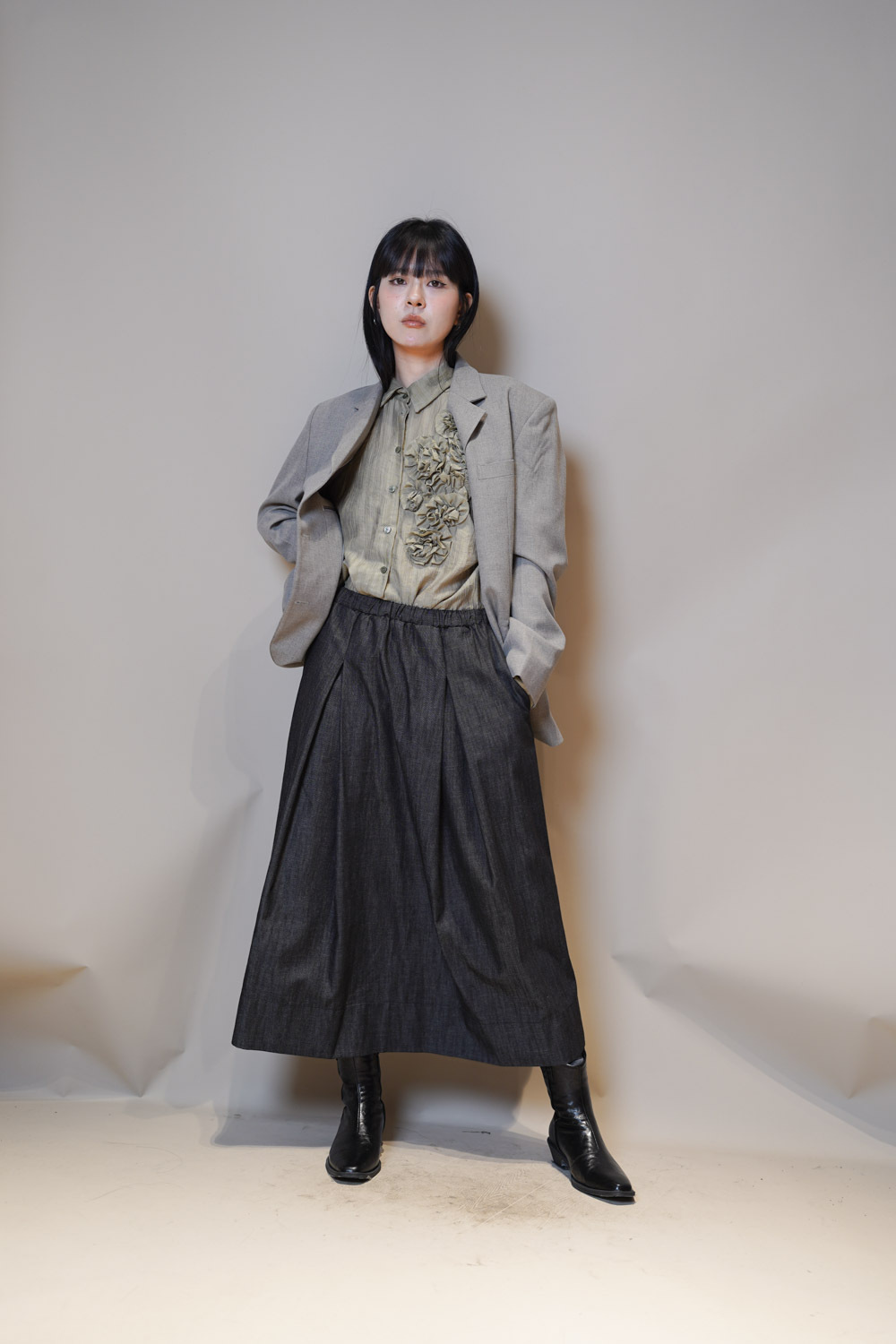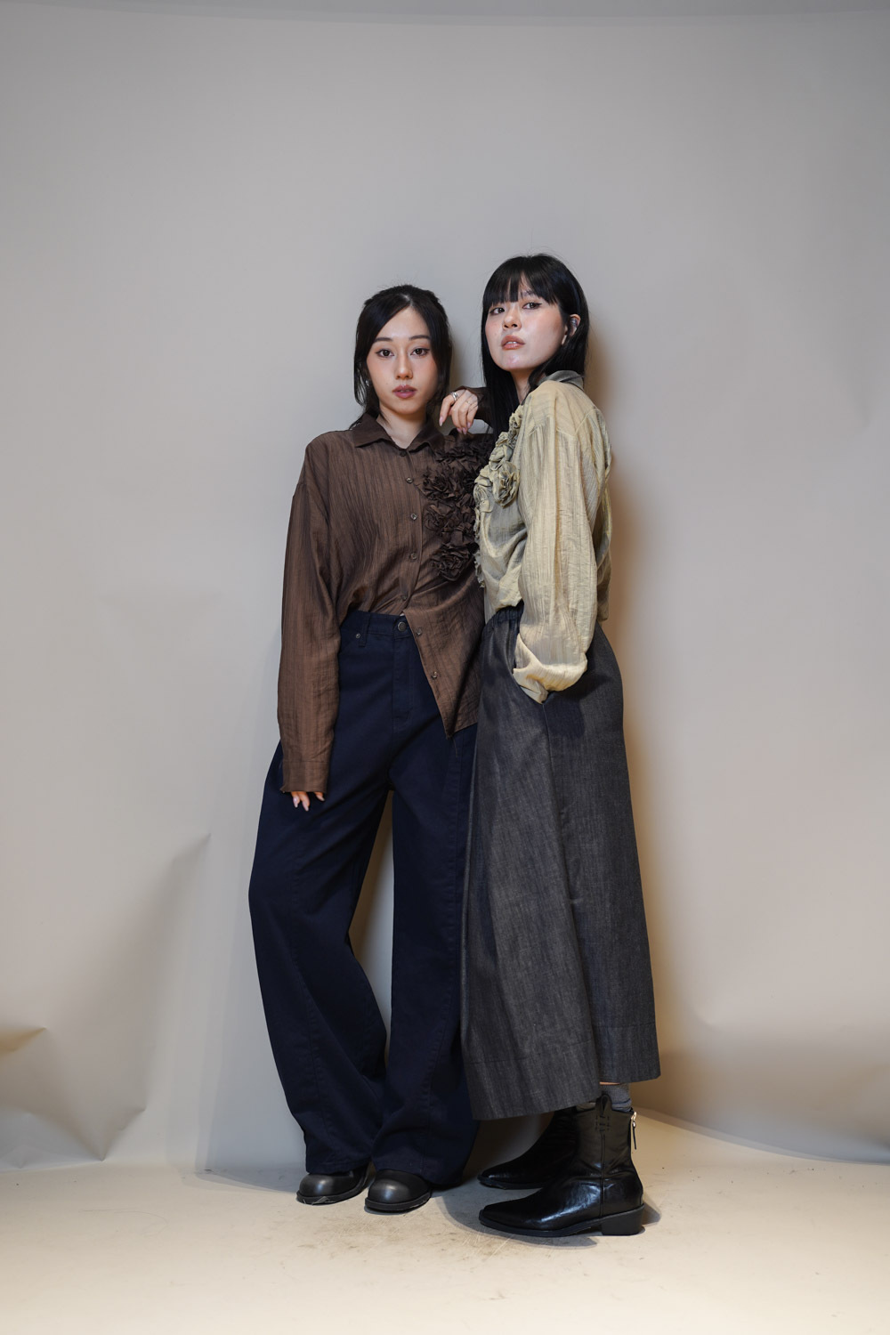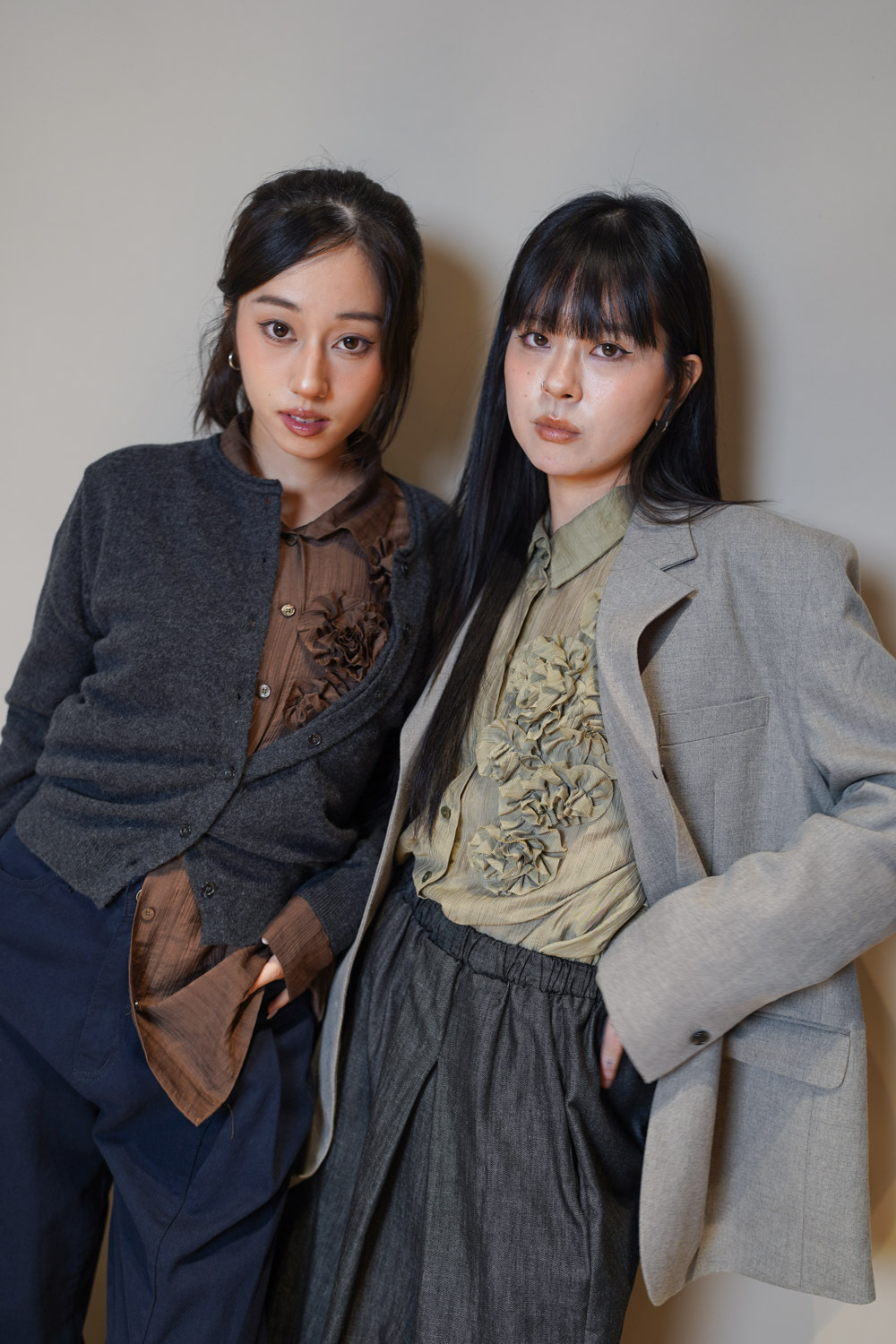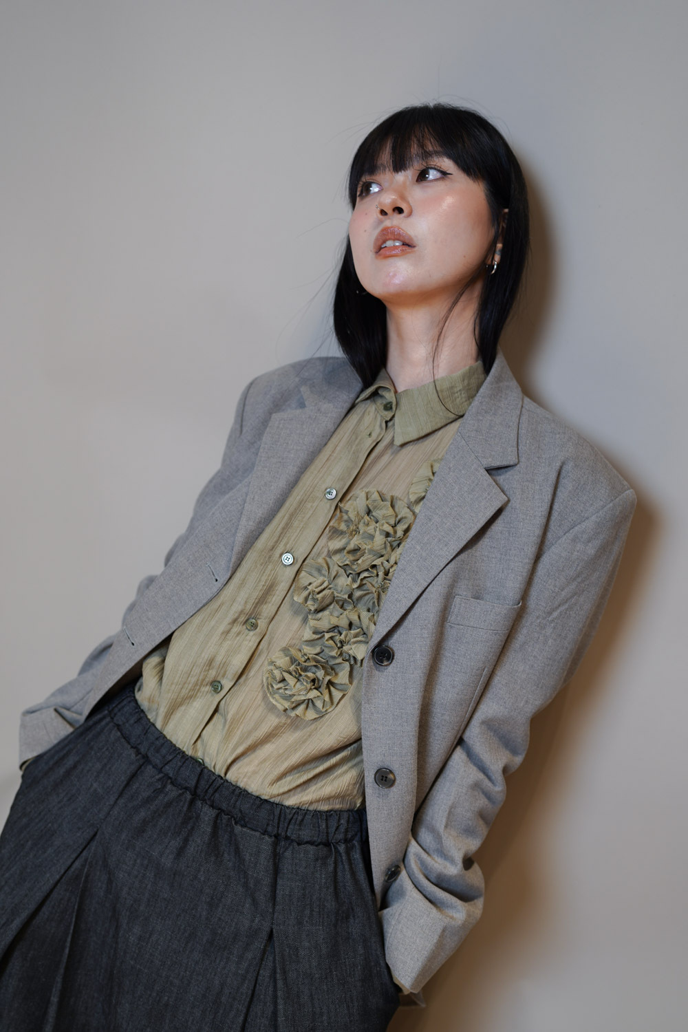 左邊胸前立體同款布料玫瑰花裝飾 玩味感十足/時尚不無聊/
